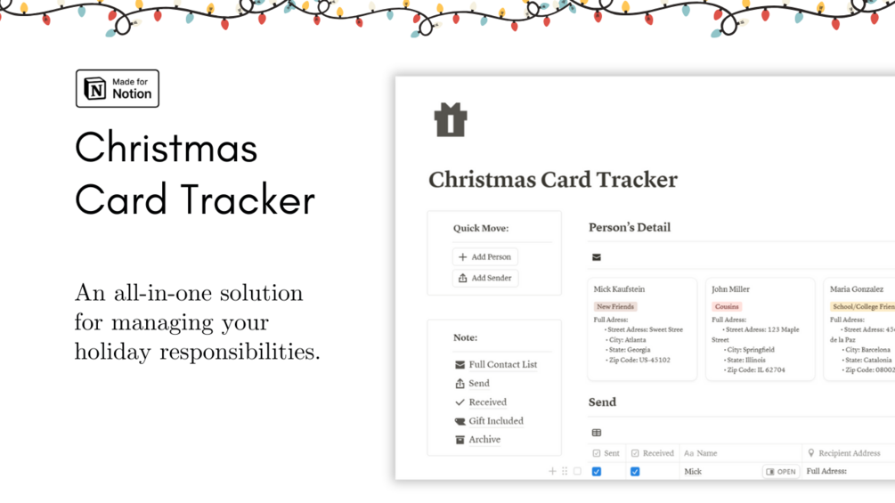 The Christmas Card Tracker Notion template is a simple and efficient tool designed to help you keep track of all your holiday greetings.
